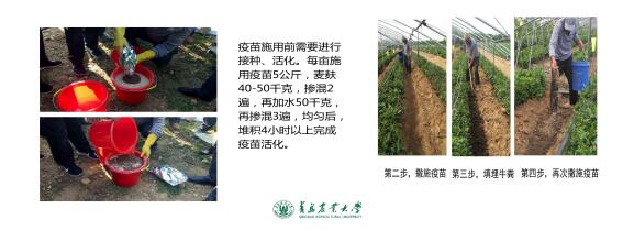 (1)疫苗施用前需要进行接种、活化。每亩施用疫苗5公斤,麦麸40-50千克,掺混2遍,再加水50千克,再掺混3遍,均匀后,堆积4小时以上完成疫苗活化。
