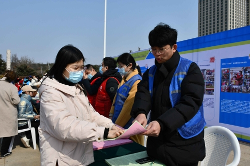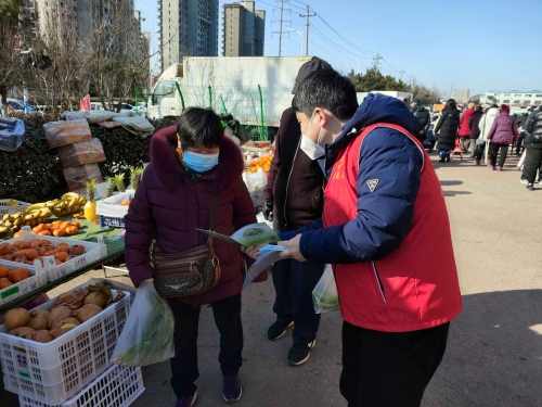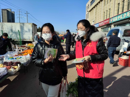文登区组织志愿者在农村大集开展宣传活动,向过往村民发放宣传资料,讲解生活垃圾分类知识,提高群众生活垃圾分类意识。