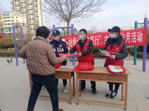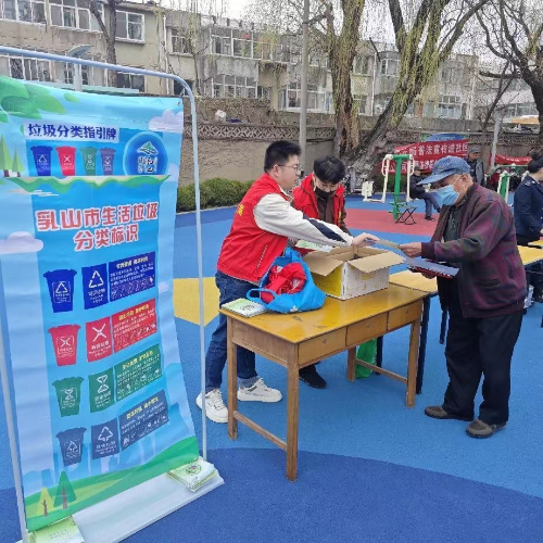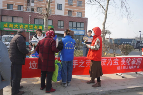 环翠区组织志愿者向村民发放宣传册,宣传生活垃圾分类相关知识。