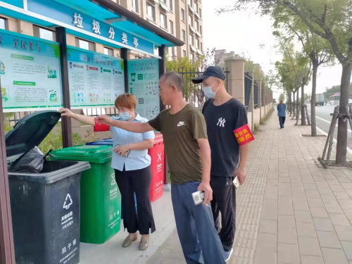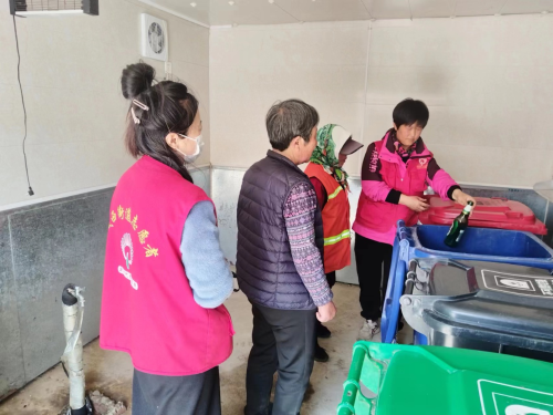 经区泊于镇屯钟家股份经济合作社生活垃圾分类指导员指导垃圾分类投放。