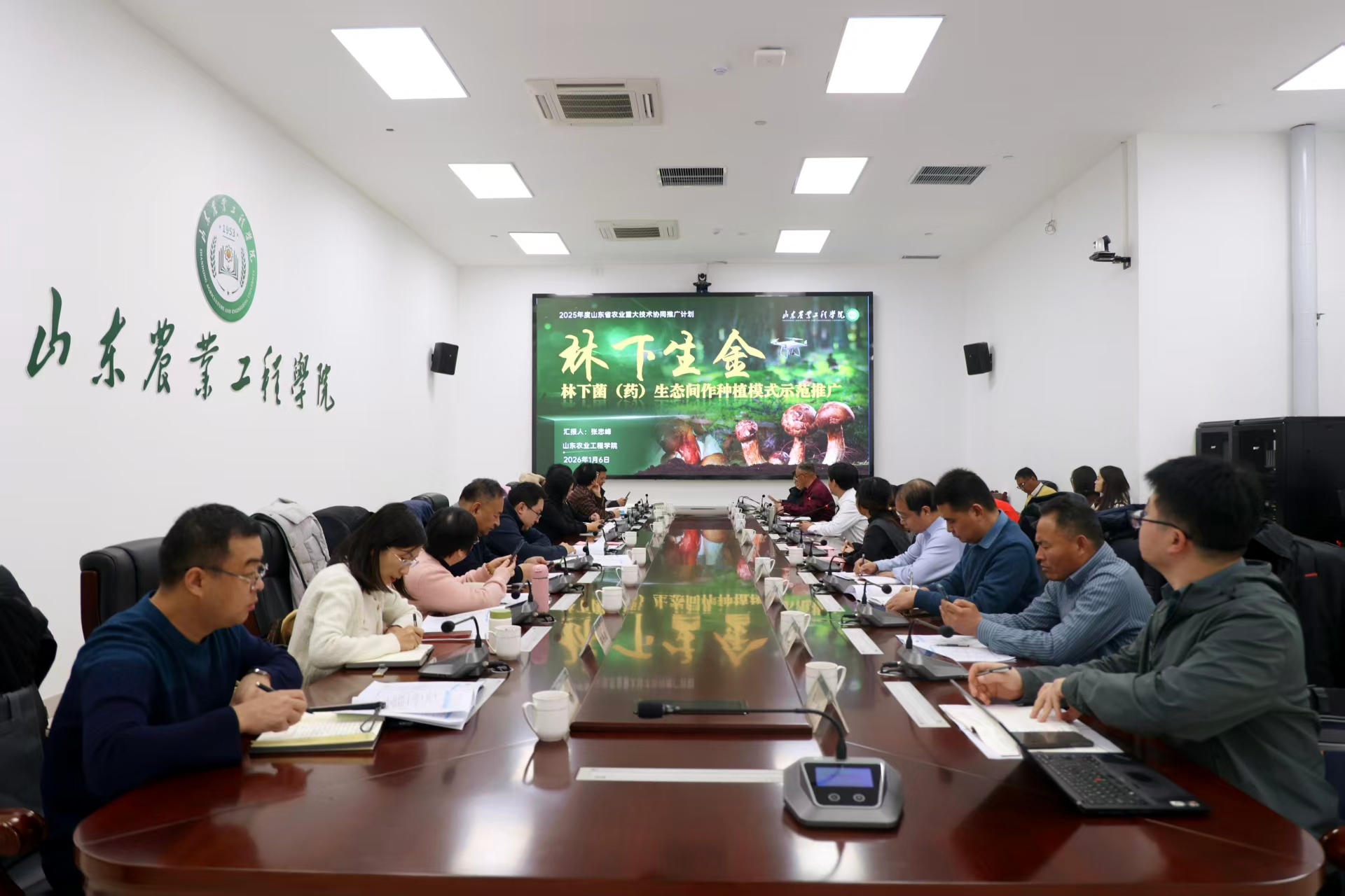 1月6日,2025年山东省农业重大技术协同推广计划项目—“林下菌(药)生态间作种植模式示范推广”启动会议在项目牵头单位山东农业工程学院淄博校区顺利召开。会议由山东农业工程学院国土资源与测绘工程学院院长、项目第一首席张忠峰教授主持,省农业农村厅科教处副处长渠通洋、山东农业工程学院党委委员、副校长郑华美、项目主办和协作单位代表、特邀专家等出席。