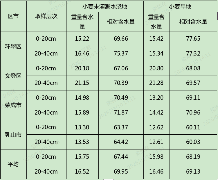 本次监测时间为2月25日—3月9日,目前我市冬小麦进入返青期。据3月10日农田土壤墒情监测结果表明:小麦水浇地土壤0-20cm平均含水量15.75%,相对含水量67.44%,20-40cm平均含水量16.52%,相对含水量69.95%;小麦旱地土壤0-20cm平均含水量15.98%,相对含水量68.19%,20-40cm平均含水量16.46%,相对含水量69.13%。依据小麦土壤墒情评价指标,全市小麦水浇地、旱地土壤墒情均适宜。
