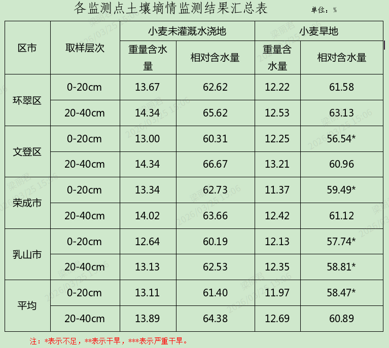 本次监测时间为3月10日—3月24日,目前我市冬小麦处于返青-拔节期。据3月25日农田土壤墒情监测结果表明:小麦水浇地土壤0-20cm平均含水量13.11%,相对含水量61.40,20-40cm平均含水量13.89%,相对含水量64.38%;小麦旱地土壤0-20cm平均含水量11.97%,相对含水量58.47%,20-40cm平均含水量12.69%,相对含水量60.89%。依据小麦土壤墒情评价指标,全市小麦水浇地墒情适宜,旱地土壤墒情文登区、荣成市、乳山市不足。